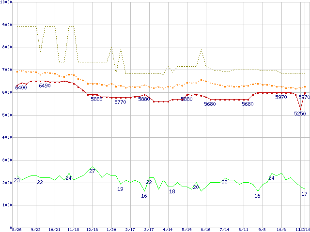 ※このグラフは過去のデータも税率5%相当に調整した税込み相当額のグラフです。 税率変更や、総額表示方式導入(2004年4月)の影響は除いています。 | | | ●凡例 | 最安値 (点線部は販売店未確認 または未調査) | 平均値 | 最高値 | ショップ数 |