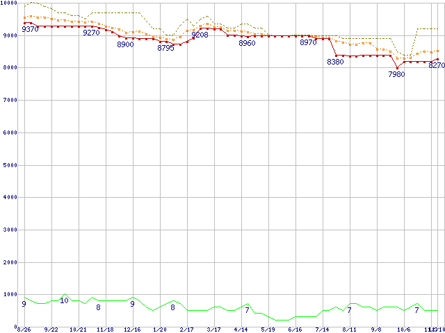 ※このグラフは過去のデータも税率5%相当に調整した税込み相当額のグラフです。 税率変更や、総額表示方式導入(2004年4月)の影響は除いています。 | | | ●凡例 | 最安値 (点線部は販売店未確認 または未調査) | 平均値 | 最高値 | ショップ数 |