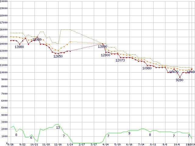 ※このグラフは過去のデータも税率5%相当に調整した税込み相当額のグラフです。 税率変更や、総額表示方式導入(2004年4月)の影響は除いています。 | | | ●凡例 | 最安値 (点線部は販売店未確認 または未調査) | 平均値 | 最高値 | ショップ数 |