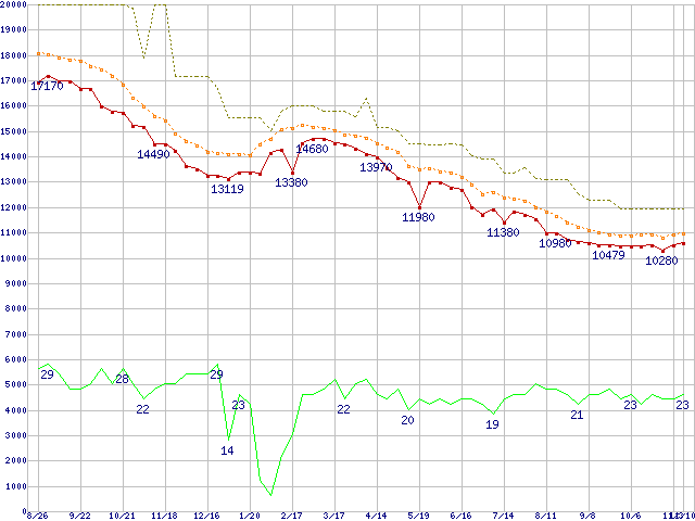 ※このグラフは過去のデータも税率5%相当に調整した税込み相当額のグラフです。 税率変更や、総額表示方式導入(2004年4月)の影響は除いています。 | | | ●凡例 | 最安値 (点線部は販売店未確認 または未調査) | 平均値 | 最高値 | ショップ数 |