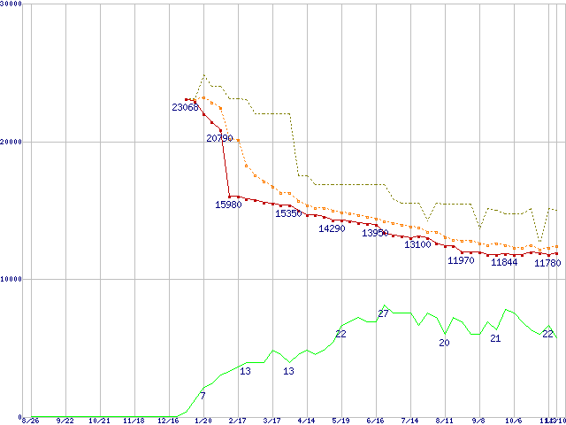 ※このグラフは過去のデータも税率5%相当に調整した税込み相当額のグラフです。 税率変更や、総額表示方式導入(2004年4月)の影響は除いています。 | | | ●凡例 | 最安値 (点線部は販売店未確認 または未調査) | 平均値 | 最高値 | ショップ数 |