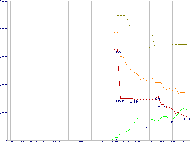 ※このグラフは過去のデータも税率5%相当に調整した税込み相当額のグラフです。 税率変更や、総額表示方式導入(2004年4月)の影響は除いています。 | | | ●凡例 | 最安値 (点線部は販売店未確認 または未調査) | 平均値 | 最高値 | ショップ数 |