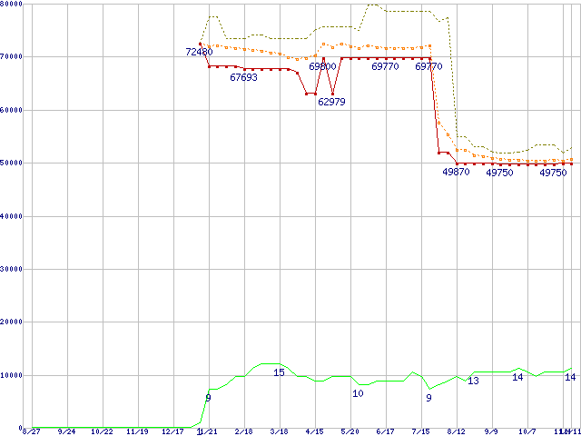 ※このグラフは過去のデータも税率5%相当に調整した税込み相当額のグラフです。 税率変更や、総額表示方式導入(2004年4月)の影響は除いています。 | | | ●凡例 | 最安値 (点線部は販売店未確認 または未調査) | 平均値 | 最高値 | ショップ数 |