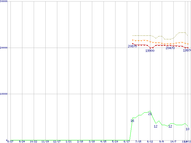 ※このグラフは過去のデータも税率5%相当に調整した税込み相当額のグラフです。 税率変更や、総額表示方式導入(2004年4月)の影響は除いています。 | | | ●凡例 | 最安値 (点線部は販売店未確認 または未調査) | 平均値 | 最高値 | ショップ数 |