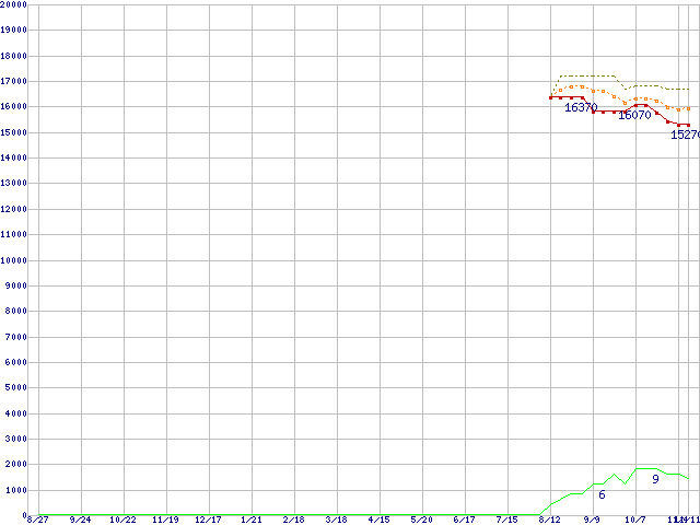 ※このグラフは過去のデータも税率5%相当に調整した税込み相当額のグラフです。 税率変更や、総額表示方式導入(2004年4月)の影響は除いています。 | | | ●凡例 | 最安値 (点線部は販売店未確認 または未調査) | 平均値 | 最高値 | ショップ数 |