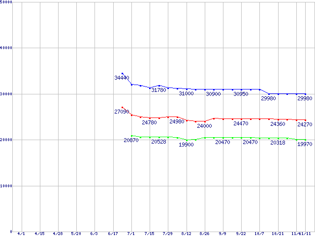 | LGA 775 (FSB 800MHz,L2 1MB,Hyper-Threading,EM64T・NX bit対応)の最安値推移 | | | (2005年4月1日~2005年11月11日) |