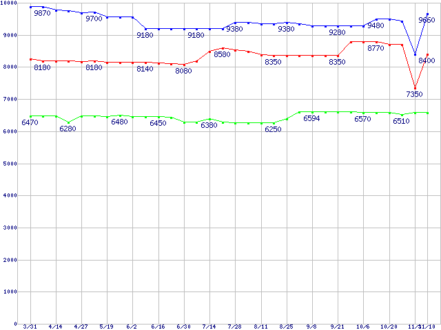 | Barracuda 7200.7 SATA (7200rpm,Serial ATA,NCQ,8MB,80GB/Platter)の最安値推移 | | | (2005年3月31日~2005年11月10日) |