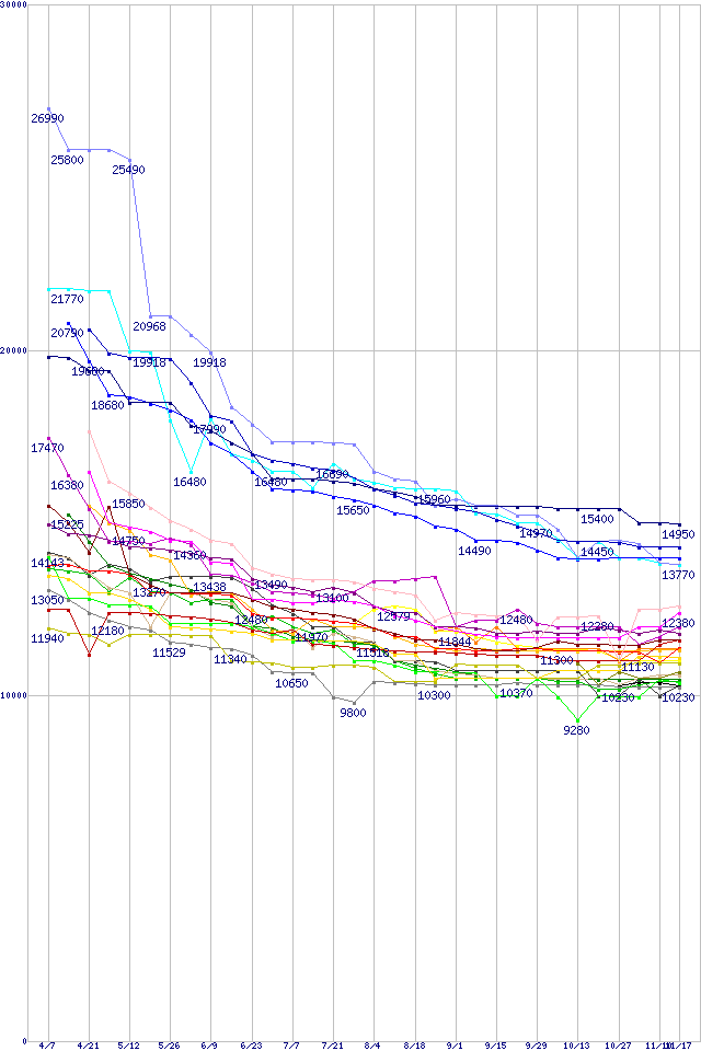 HDD主要製品(最安値1万円~1万5千円未満)の最安値推移