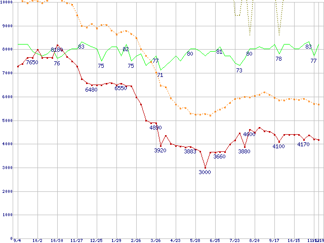 ※このグラフは過去のデータも税率5%相当に調整した税込み相当額のグラフです。 税率変更や、総額表示方式導入(2004年4月)の影響は除いています。 | | | ●凡例 | 最安値 (点線部は販売店未確認 または未調査) | 平均値 | 最高値 | ショップ数 |