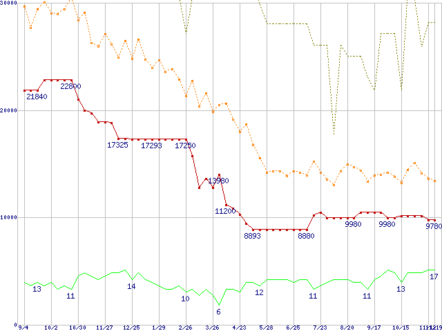 ※このグラフは過去のデータも税率5%相当に調整した税込み相当額のグラフです。 税率変更や、総額表示方式導入(2004年4月)の影響は除いています。 | | | ●凡例 | 最安値 (点線部は販売店未確認 または未調査) | 平均値 | 最高値 | ショップ数 |