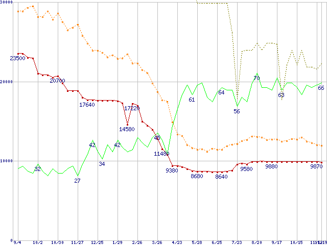 ※このグラフは過去のデータも税率5%相当に調整した税込み相当額のグラフです。 税率変更や、総額表示方式導入(2004年4月)の影響は除いています。 | | | ●凡例 | 最安値 (点線部は販売店未確認 または未調査) | 平均値 | 最高値 | ショップ数 |