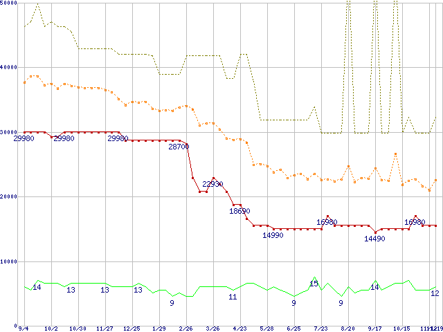 PC3200(DDR400) DDR SDRAM DIMM ECC対応 Registeredタイプの最安値推移