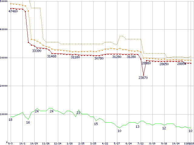 ※このグラフは過去のデータも税率5%相当に調整した税込み相当額のグラフです。 税率変更や、総額表示方式導入(2004年4月)の影響は除いています。 | | | ●凡例 | 最安値 (点線部は販売店未確認 または未調査) | 平均値 | 最高値 | ショップ数 |