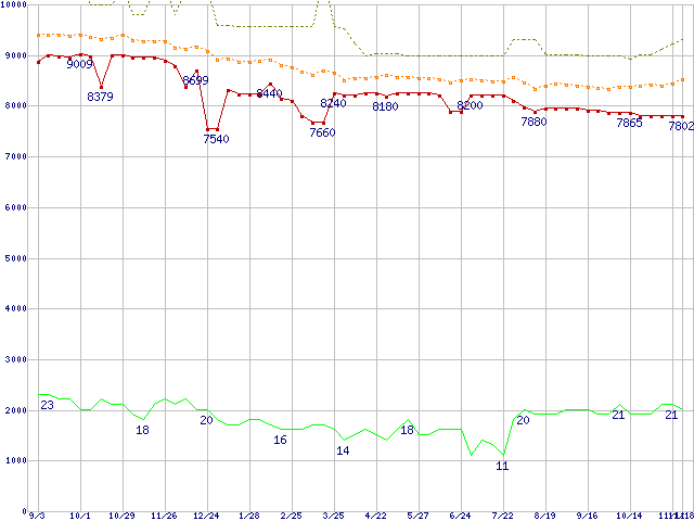 ※このグラフは過去のデータも税率5%相当に調整した税込み相当額のグラフです。 税率変更や、総額表示方式導入(2004年4月)の影響は除いています。 | | | ●凡例 | 最安値 (点線部は販売店未確認 または未調査) | 平均値 | 最高値 | ショップ数 |