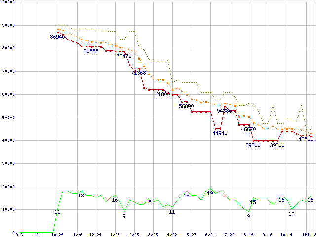 | Athlon 64 4000+ (2.4GHz,L2 1MB)の価格推移 | | | (2004年9月3日~2005年11月18日) |