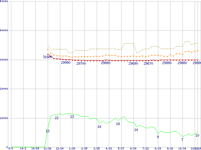 ※このグラフは過去のデータも税率5%相当に調整した税込み相当額のグラフです。 税率変更や、総額表示方式導入(2004年4月)の影響は除いています。 | | | ●凡例 | 最安値 (点線部は販売店未確認 または未調査) | 平均値 | 最高値 | ショップ数 |