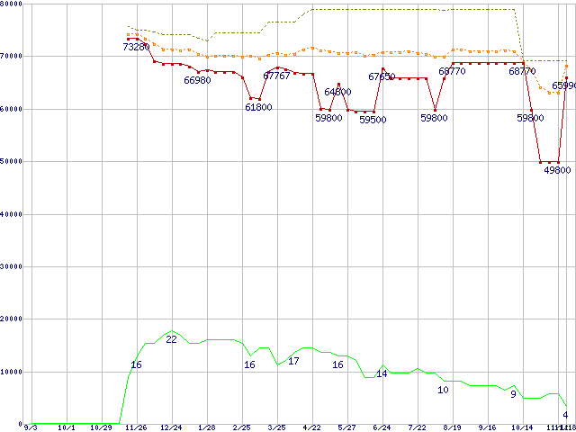 ※このグラフは過去のデータも税率5%相当に調整した税込み相当額のグラフです。 税率変更や、総額表示方式導入(2004年4月)の影響は除いています。 | | | ●凡例 | 最安値 (点線部は販売店未確認 または未調査) | 平均値 | 最高値 | ショップ数 |