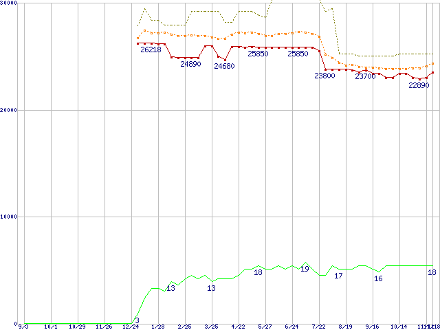 ※このグラフは過去のデータも税率5%相当に調整した税込み相当額のグラフです。 税率変更や、総額表示方式導入(2004年4月)の影響は除いています。 | | | ●凡例 | 最安値 (点線部は販売店未確認 または未調査) | 平均値 | 最高値 | ショップ数 |