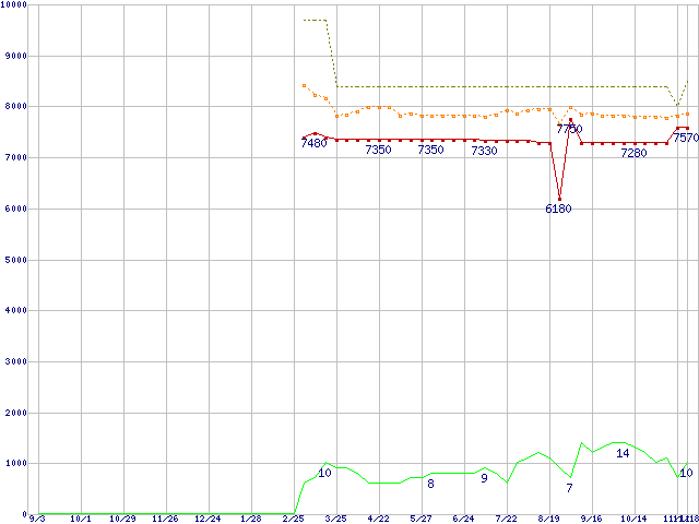 ※このグラフは過去のデータも税率5%相当に調整した税込み相当額のグラフです。 税率変更や、総額表示方式導入(2004年4月)の影響は除いています。 | | | ●凡例 | 最安値 (点線部は販売店未確認 または未調査) | 平均値 | 最高値 | ショップ数 |