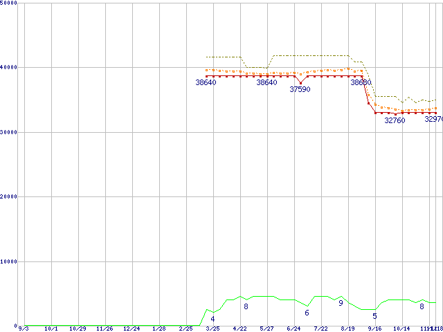 ※このグラフは過去のデータも税率5%相当に調整した税込み相当額のグラフです。 税率変更や、総額表示方式導入(2004年4月)の影響は除いています。 | | | ●凡例 | 最安値 (点線部は販売店未確認 または未調査) | 平均値 | 最高値 | ショップ数 |