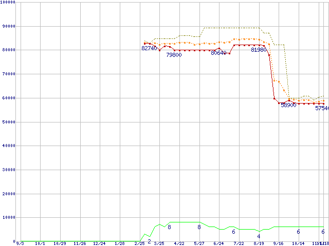 ※このグラフは過去のデータも税率5%相当に調整した税込み相当額のグラフです。 税率変更や、総額表示方式導入(2004年4月)の影響は除いています。 | | | ●凡例 | 最安値 (点線部は販売店未確認 または未調査) | 平均値 | 最高値 | ショップ数 |