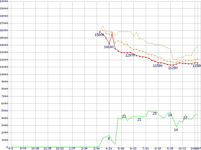 ※このグラフは過去のデータも税率5%相当に調整した税込み相当額のグラフです。 税率変更や、総額表示方式導入(2004年4月)の影響は除いています。 | | | ●凡例 | 最安値 (点線部は販売店未確認 または未調査) | 平均値 | 最高値 | ショップ数 |