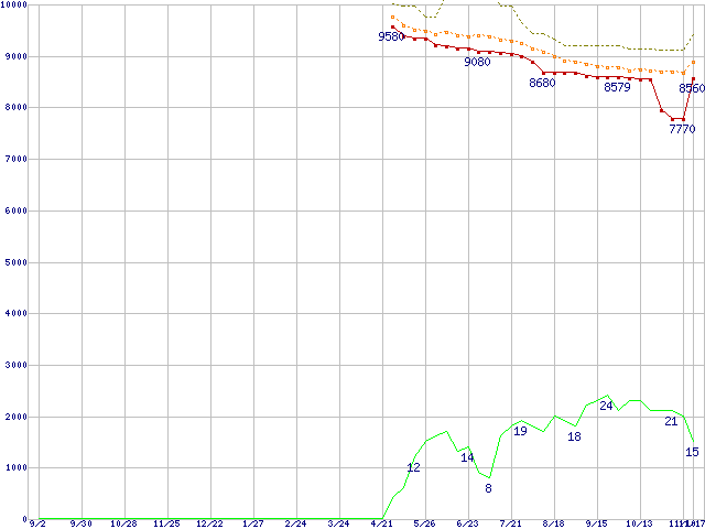 ※このグラフは過去のデータも税率5%相当に調整した税込み相当額のグラフです。 税率変更や、総額表示方式導入(2004年4月)の影響は除いています。 | | | ●凡例 | 最安値 (点線部は販売店未確認 または未調査) | 平均値 | 最高値 | ショップ数 |
