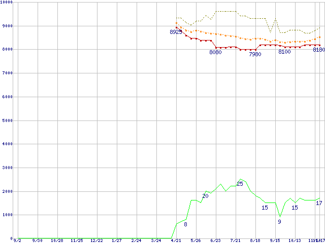 ※このグラフは過去のデータも税率5%相当に調整した税込み相当額のグラフです。 税率変更や、総額表示方式導入(2004年4月)の影響は除いています。 | | | ●凡例 | 最安値 (点線部は販売店未確認 または未調査) | 平均値 | 最高値 | ショップ数 |