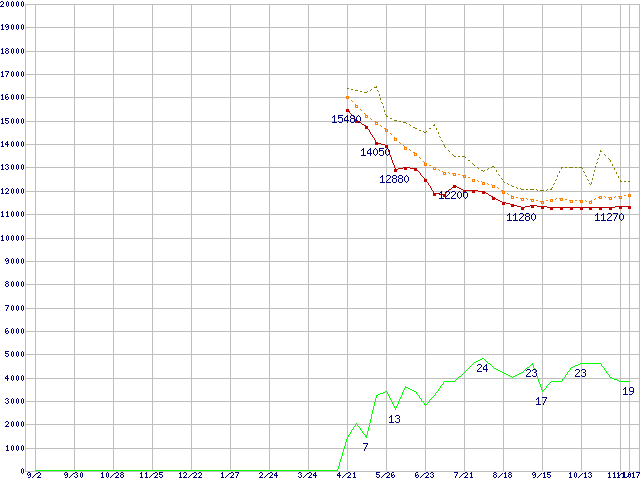 ※このグラフは過去のデータも税率5%相当に調整した税込み相当額のグラフです。 税率変更や、総額表示方式導入(2004年4月)の影響は除いています。 | | | ●凡例 | 最安値 (点線部は販売店未確認 または未調査) | 平均値 | 最高値 | ショップ数 |