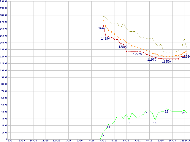 ※このグラフは過去のデータも税率5%相当に調整した税込み相当額のグラフです。 税率変更や、総額表示方式導入(2004年4月)の影響は除いています。 | | | ●凡例 | 最安値 (点線部は販売店未確認 または未調査) | 平均値 | 最高値 | ショップ数 |