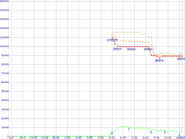 ※このグラフは過去のデータも税率5%相当に調整した税込み相当額のグラフです。 税率変更や、総額表示方式導入(2004年4月)の影響は除いています。 | | | ●凡例 | 最安値 (点線部は販売店未確認 または未調査) | 平均値 | 最高値 | ショップ数 |