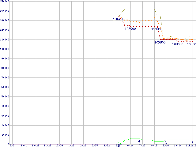 ※このグラフは過去のデータも税率5%相当に調整した税込み相当額のグラフです。 税率変更や、総額表示方式導入(2004年4月)の影響は除いています。 | | | ●凡例 | 最安値 (点線部は販売店未確認 または未調査) | 平均値 | 最高値 | ショップ数 |
