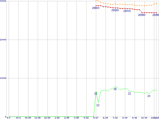 ※このグラフは過去のデータも税率5%相当に調整した税込み相当額のグラフです。 税率変更や、総額表示方式導入(2004年4月)の影響は除いています。 | | | ●凡例 | 最安値 (点線部は販売店未確認 または未調査) | 平均値 | 最高値 | ショップ数 |