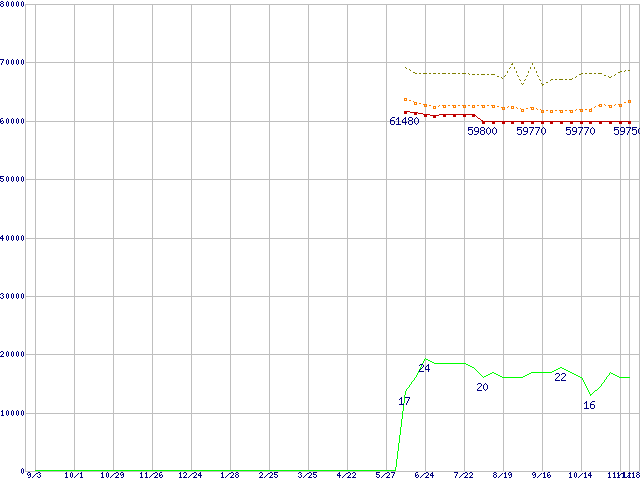 ※このグラフは過去のデータも税率5%相当に調整した税込み相当額のグラフです。 税率変更や、総額表示方式導入(2004年4月)の影響は除いています。 | | | ●凡例 | 最安値 (点線部は販売店未確認 または未調査) | 平均値 | 最高値 | ショップ数 |