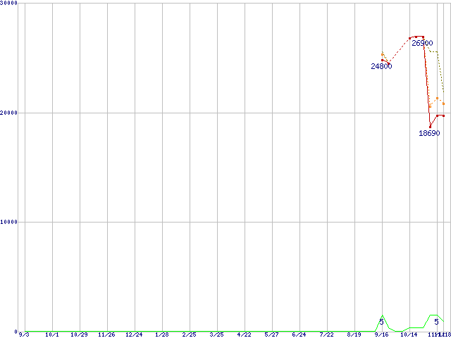 ※このグラフは過去のデータも税率5%相当に調整した税込み相当額のグラフです。 税率変更や、総額表示方式導入(2004年4月)の影響は除いています。 | | | ●凡例 | 最安値 (点線部は販売店未確認 または未調査) | 平均値 | 最高値 | ショップ数 |