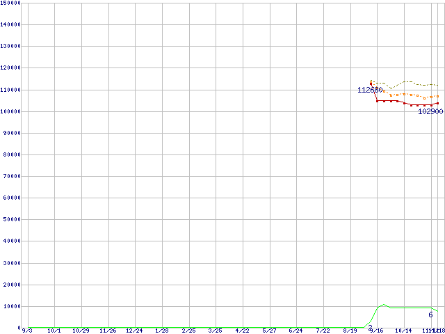 ※このグラフは過去のデータも税率5%相当に調整した税込み相当額のグラフです。 税率変更や、総額表示方式導入(2004年4月)の影響は除いています。 | | | ●凡例 | 最安値 (点線部は販売店未確認 または未調査) | 平均値 | 最高値 | ショップ数 |