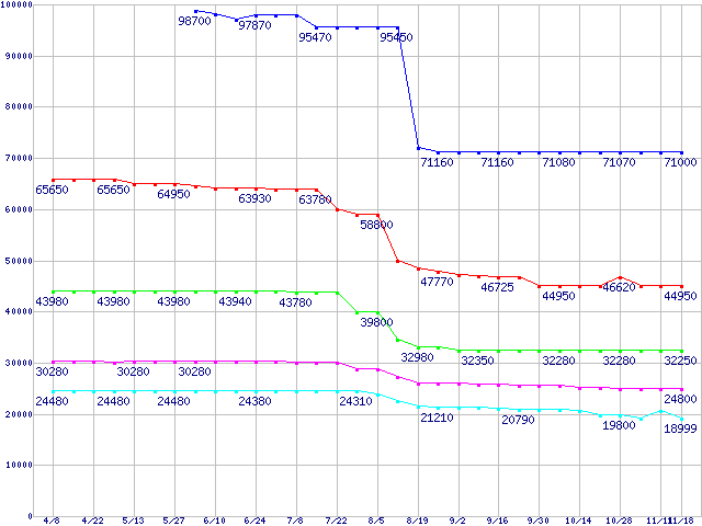 | LGA 775 (FSB 800MHz,L2 2MB,Hyper-Threading,EM64T対応)の最安値推移 | | | (2005年4月8日~2005年11月18日) |