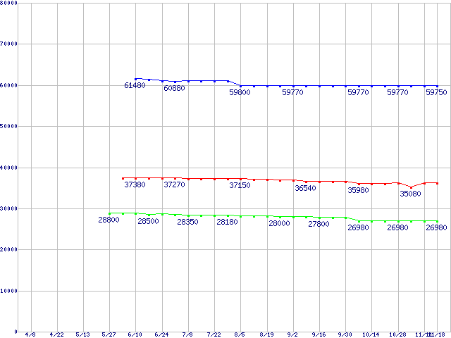 | LGA 775 (FSB 800MHz,L2 1MB×2,Dual Core,EM64T対応)の最安値推移 | | | (2005年4月8日~2005年11月18日) |