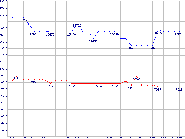 | PC2700(DDR333) DDR SDRAM DIMM ECC対応 Registeredタイプの最安値推移 | | | (2005年4月9日~2005年11月19日) |