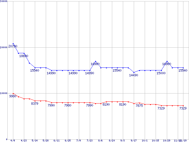 | PC3200(DDR400) DDR SDRAM DIMM ECC対応 Registeredタイプの最安値推移 | | | (2005年4月9日~2005年11月19日) |
