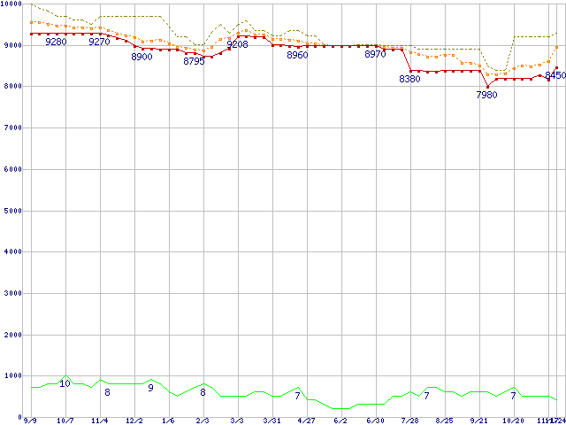 ※このグラフは過去のデータも税率5%相当に調整した税込み相当額のグラフです。 税率変更や、総額表示方式導入(2004年4月)の影響は除いています。 | | | ●凡例 | 最安値 (点線部は販売店未確認 または未調査) | 平均値 | 最高値 | ショップ数 |
