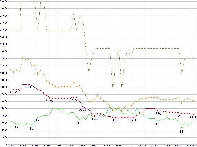 ※このグラフは過去のデータも税率5%相当に調整した税込み相当額のグラフです。 税率変更や、総額表示方式導入(2004年4月)の影響は除いています。 | | | ●凡例 | 最安値 (点線部は販売店未確認 または未調査) | 平均値 | 最高値 | ショップ数 |