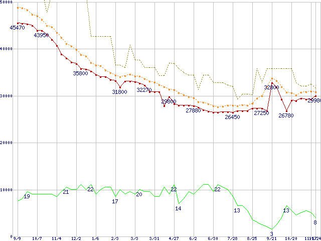 ※このグラフは過去のデータも税率5%相当に調整した税込み相当額のグラフです。 税率変更や、総額表示方式導入(2004年4月)の影響は除いています。 | | | ●凡例 | 最安値 (点線部は販売店未確認 または未調査) | 平均値 | 最高値 | ショップ数 |