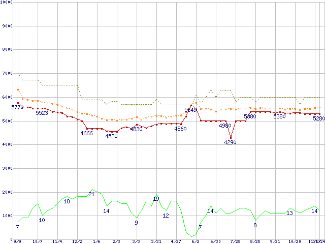 ※このグラフは過去のデータも税率5%相当に調整した税込み相当額のグラフです。 税率変更や、総額表示方式導入(2004年4月)の影響は除いています。 | | | ●凡例 | 最安値 (点線部は販売店未確認 または未調査) | 平均値 | 最高値 | ショップ数 |