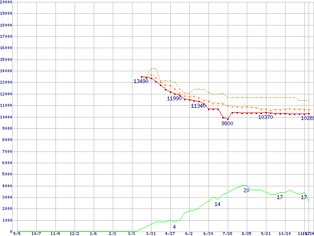 ※このグラフは過去のデータも税率5%相当に調整した税込み相当額のグラフです。 税率変更や、総額表示方式導入(2004年4月)の影響は除いています。 | | | ●凡例 | 最安値 (点線部は販売店未確認 または未調査) | 平均値 | 最高値 | ショップ数 |
