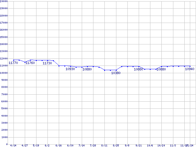 | Barracuda 7200.7 SATA (7200rpm,Serial ATA/150,8MB,100GB/Platter)の最安値推移 | | | (2005年4月14日~2005年11月24日) |