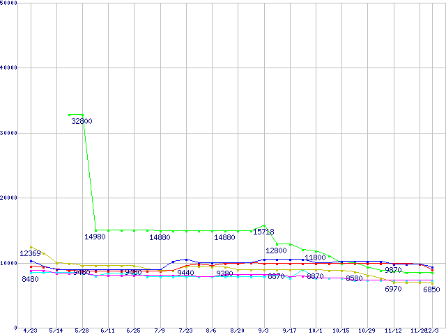 メモリ主要製品(最安値1万円以上)の最安値推移