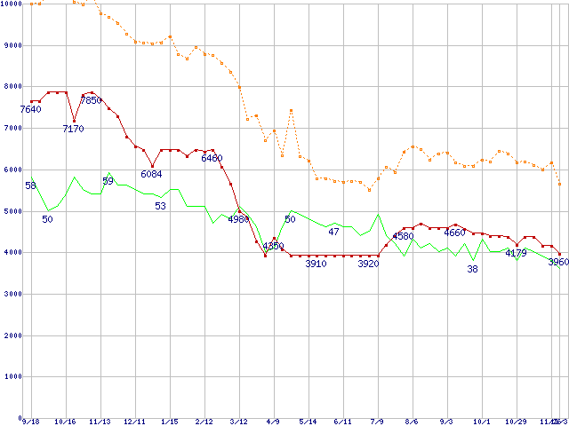 ※このグラフは過去のデータも税率5%相当に調整した税込み相当額のグラフです。 税率変更や、総額表示方式導入(2004年4月)の影響は除いています。 | | | ●凡例 | 最安値 (点線部は販売店未確認 または未調査) | 平均値 | 最高値 | ショップ数 |