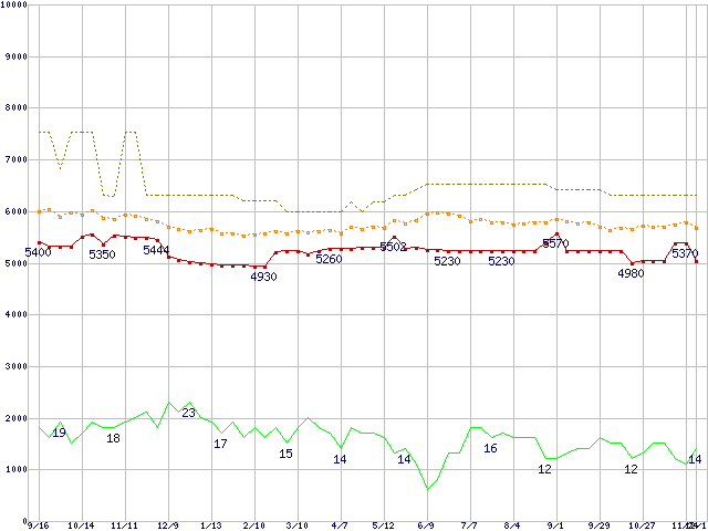 ※このグラフは過去のデータも税率5%相当に調整した税込み相当額のグラフです。 税率変更や、総額表示方式導入(2004年4月)の影響は除いています。 | | | ●凡例 | 最安値 (点線部は販売店未確認 または未調査) | 平均値 | 最高値 | ショップ数 |