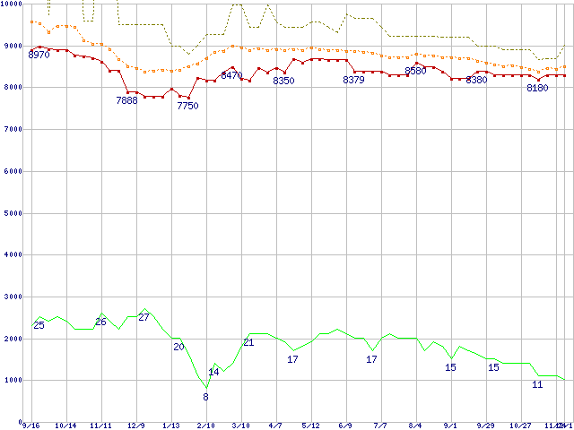 ※このグラフは過去のデータも税率5%相当に調整した税込み相当額のグラフです。 税率変更や、総額表示方式導入(2004年4月)の影響は除いています。 | | | ●凡例 | 最安値 (点線部は販売店未確認 または未調査) | 平均値 | 最高値 | ショップ数 |